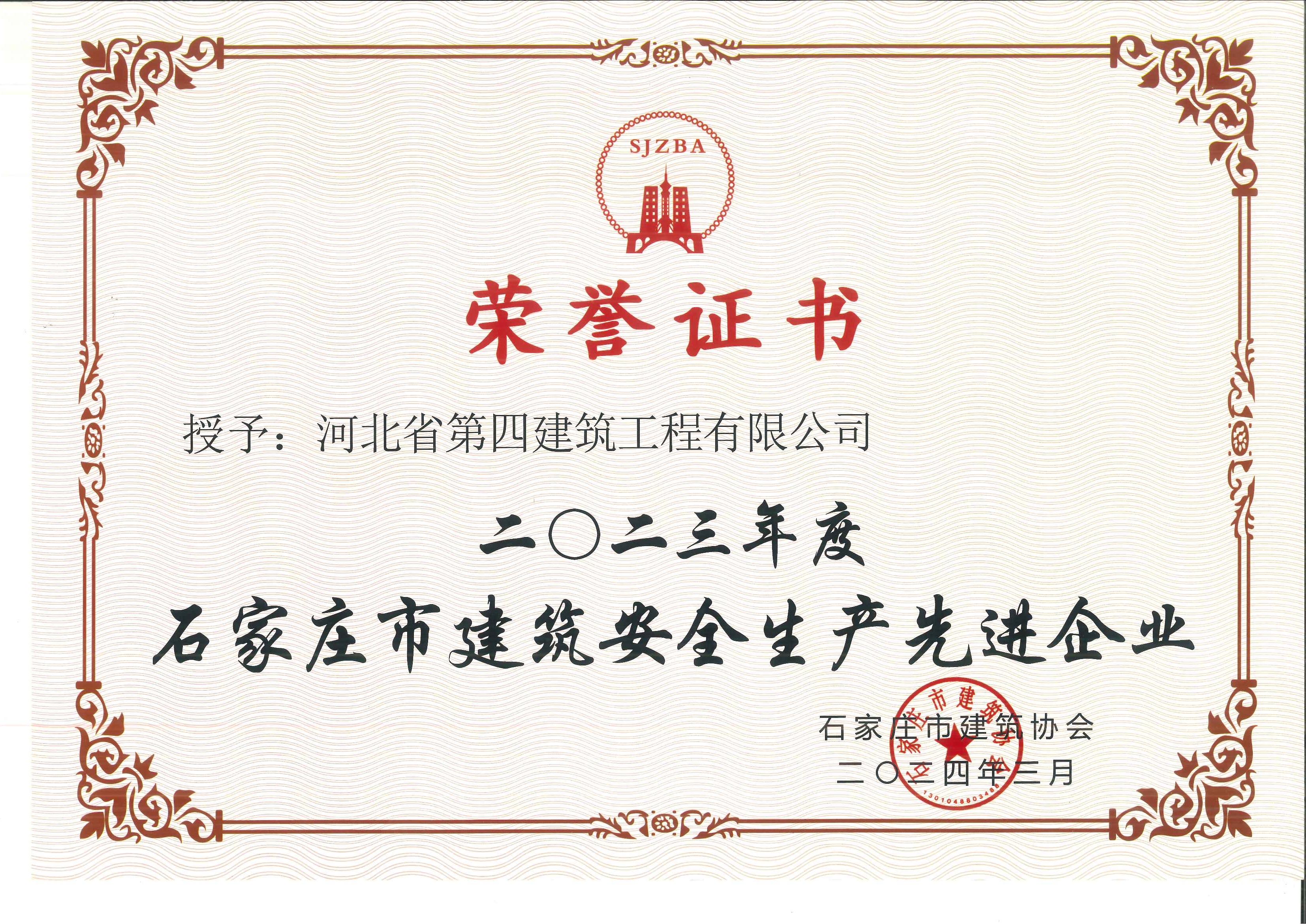 2023年度石家庄市建筑安全生产先进企业